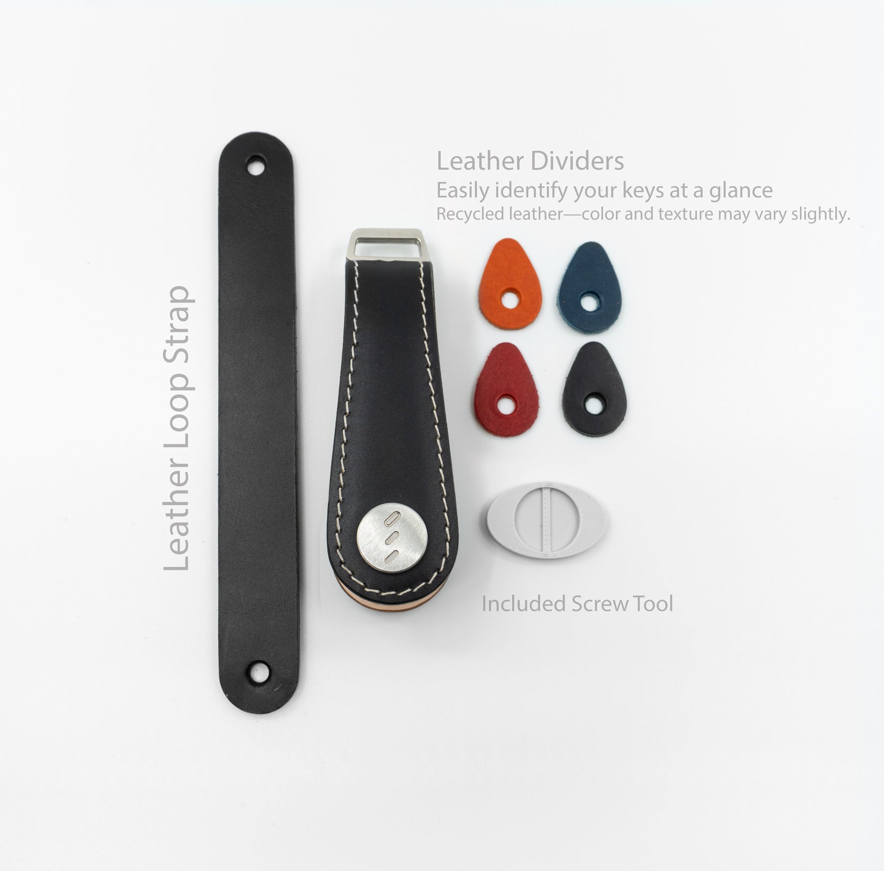 Leather Dividers – Recycled leather inserts to easily separate and identify your keys.